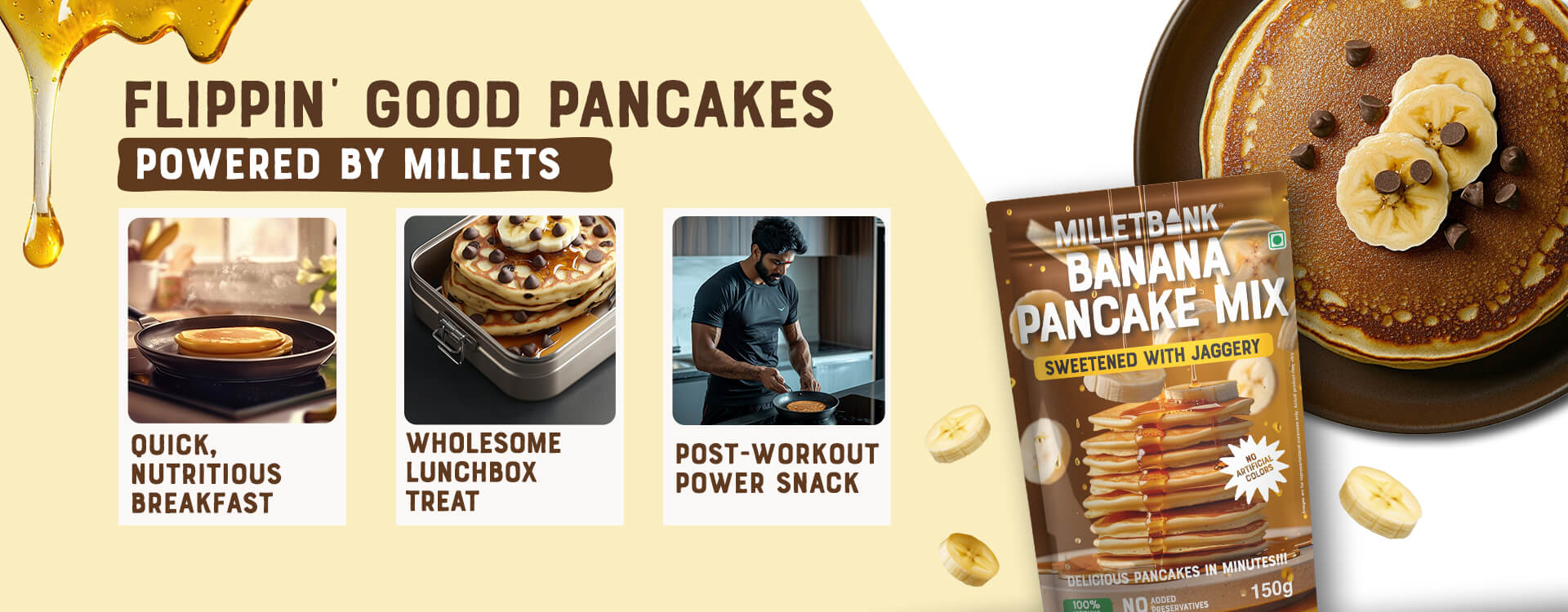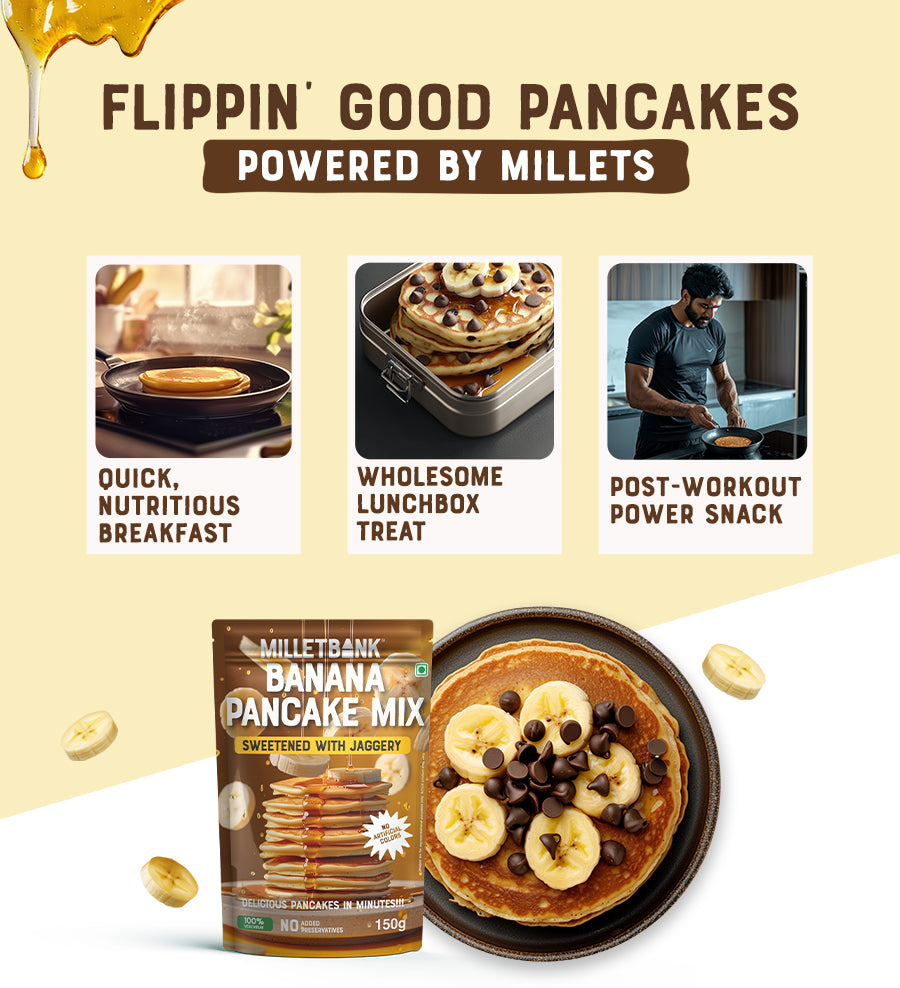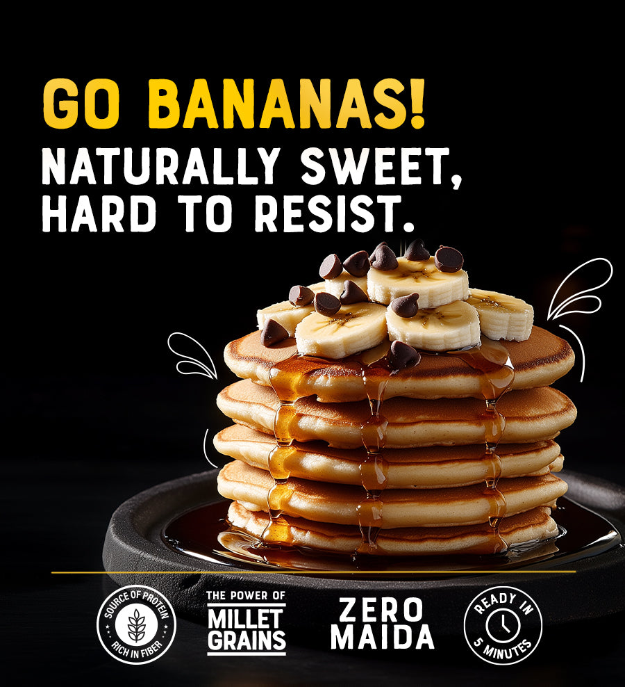 Our Banana Pancake Mix is crafted for those who love a wholesome, guilt-free breakfast. Packed with the goodness of millets, oats, and real banana powder, it's naturally sweetened with jaggery for a delightful, nourishing start to your day. Enjoy them in minutes, knowing you’re fueling your body with nutrient-rich ingredients.
