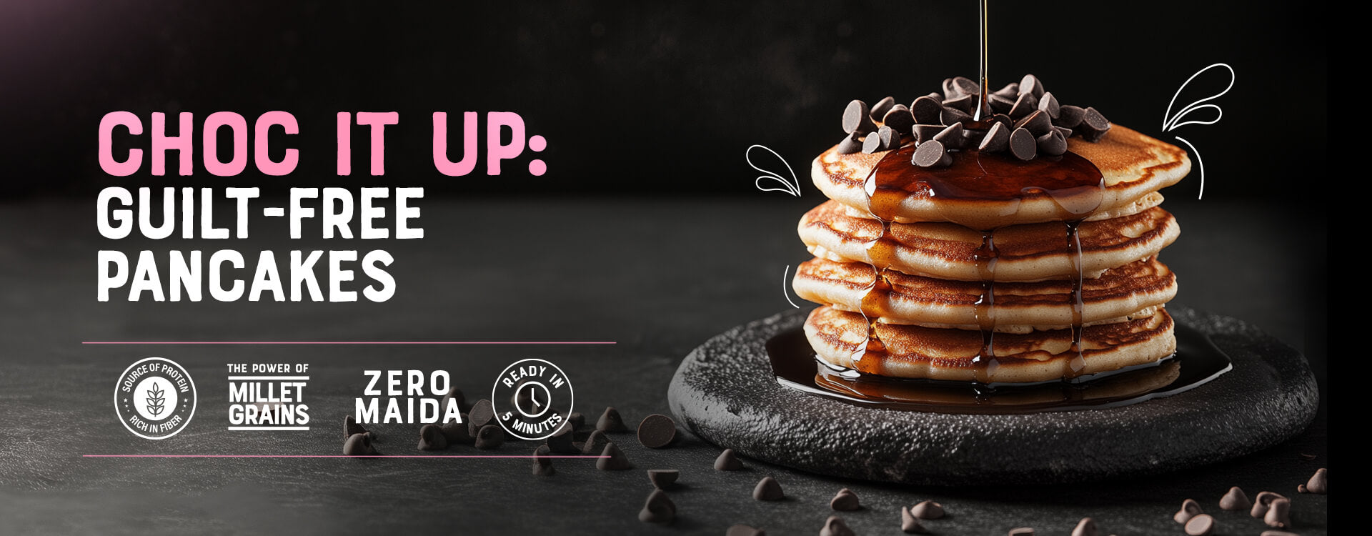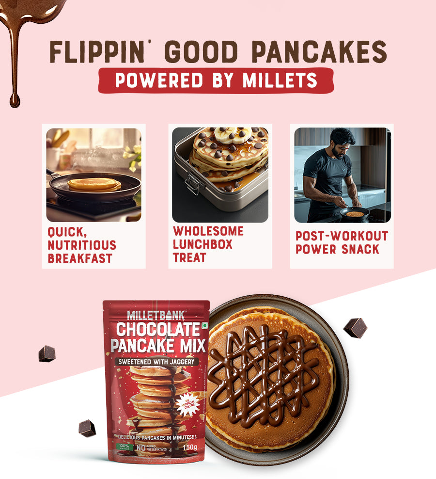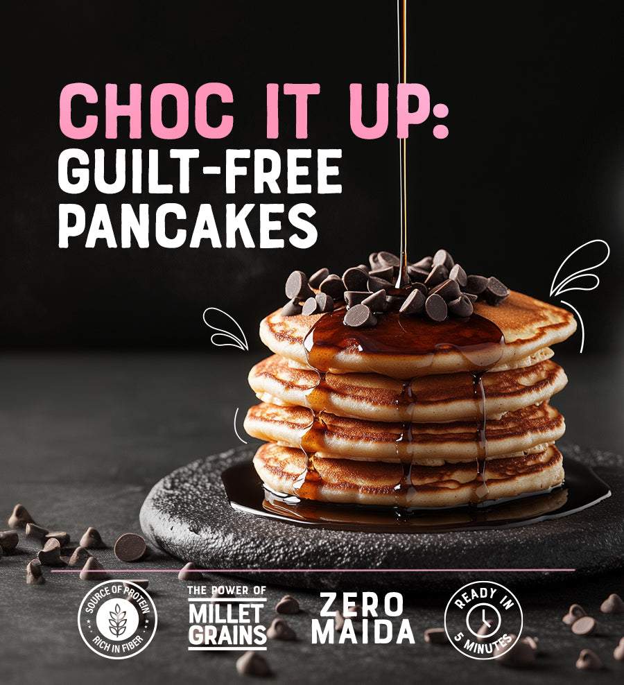 Who says indulgence can’t be healthy? Our Chocolate Pancake Mix blends real cocoa and choco chips with nutrient-rich millets for a breakfast treat that satisfies your sweet tooth while nourishing your body. Sweetened with jaggery and free from preservatives, these pancakes deliver on taste without compromising on health.