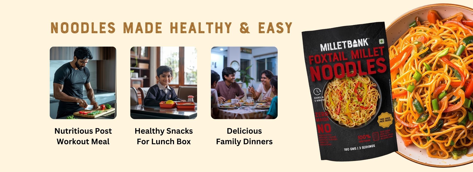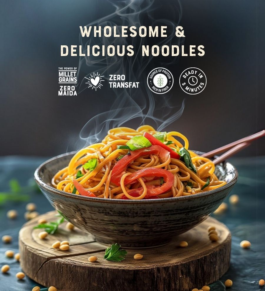In addition to noodles, you can incorporate millets into your diet through a variety of our offerings such as , Millet Pasta, cereals, breakfast mixes, snacks, and cookies. These products offer a versatile way to enjoy the health benefits of millets in different meals throughout the day.
