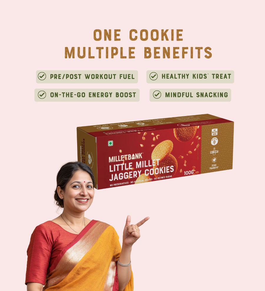 Our cookies are made with Little Millet, a grain that is rich in fibre, protein, and essential nutrients. We use jaggery instead of refined sugar , also our cookies are free from dairy, Maida , baking soda and trans-fat.
