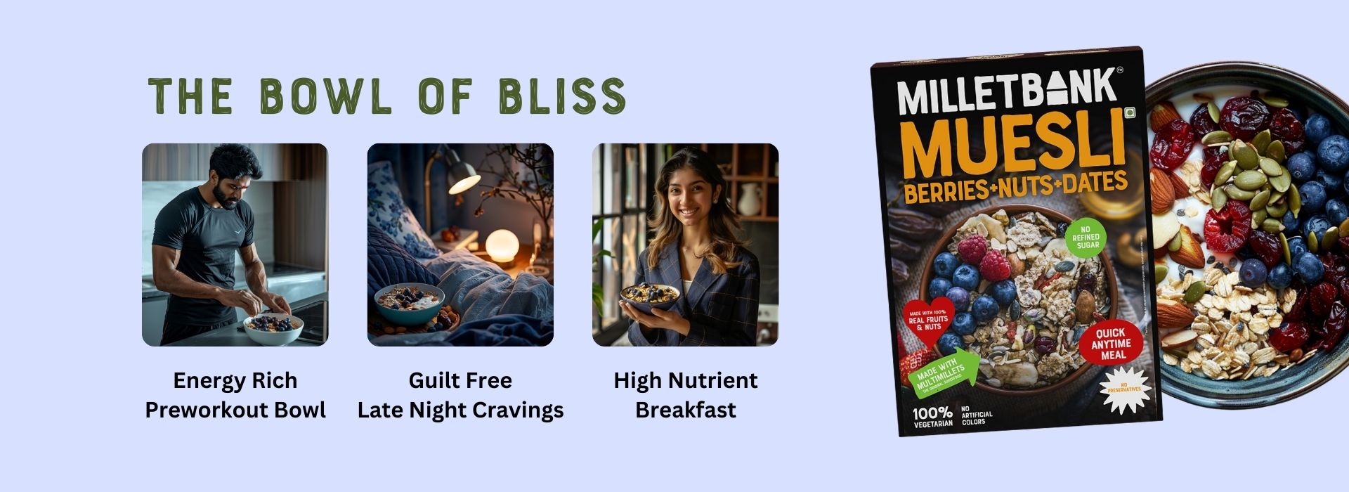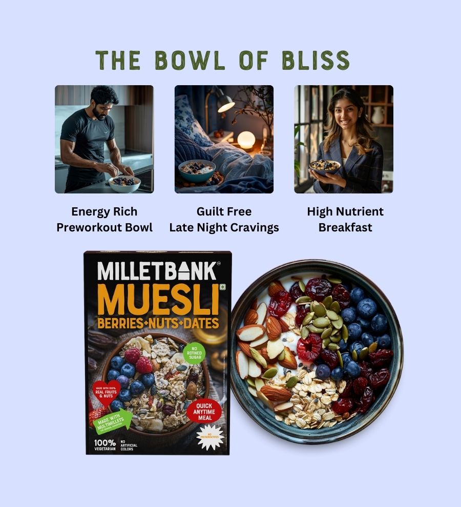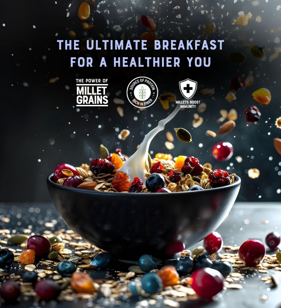 Introducing Millet Muesli: Berries Nuts and Dates, the perfect anytime meal for health-conscious foodies!