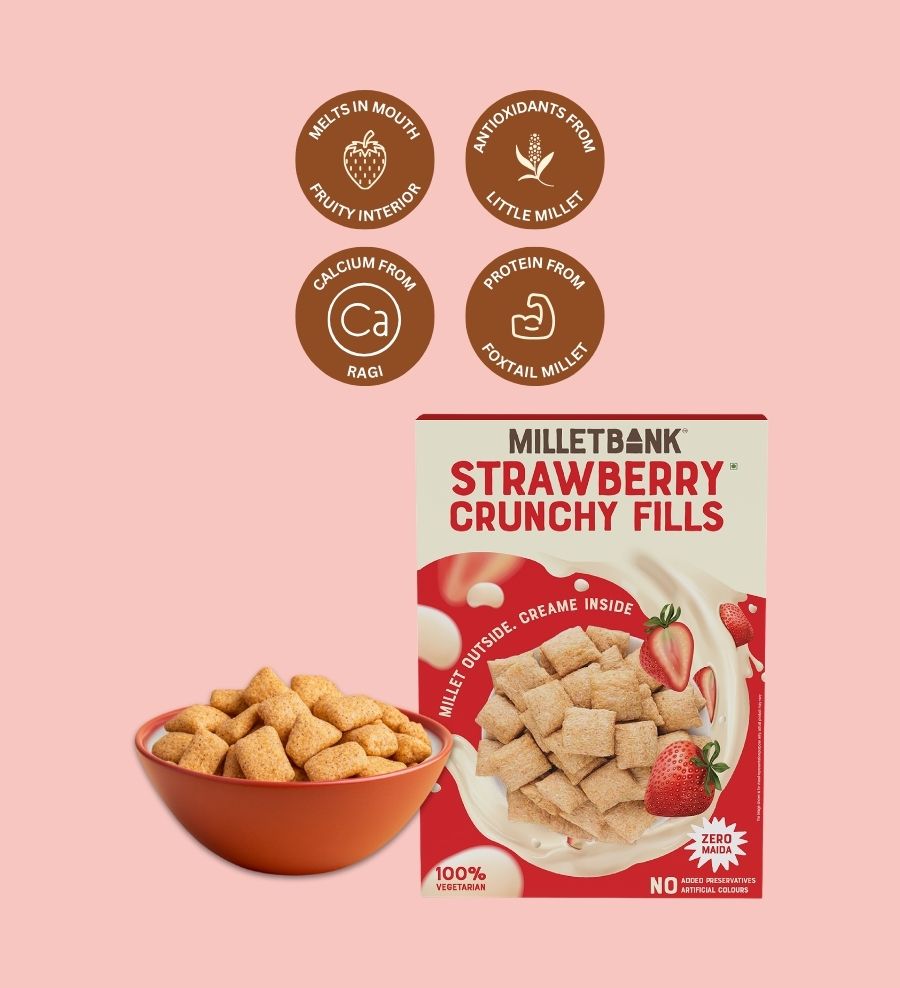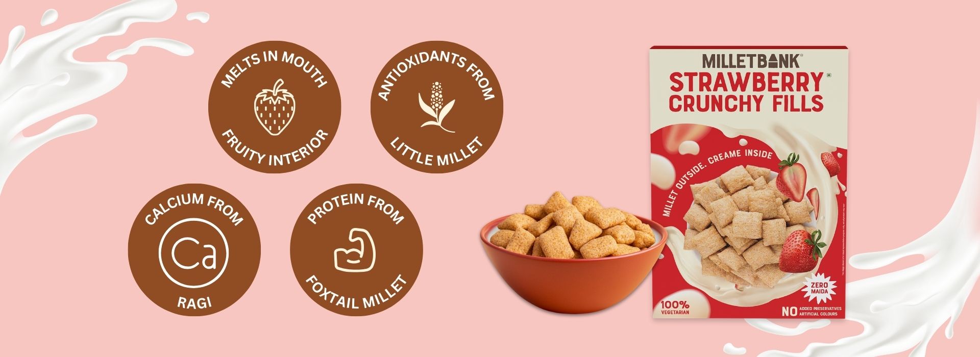 Introducing Millet Strawberry Fills: the revolutionary pack of creamy-filled pillows. Experience a delightful blend of textures with a satisfying crunch outside and a fruity, mouth-melting interior.