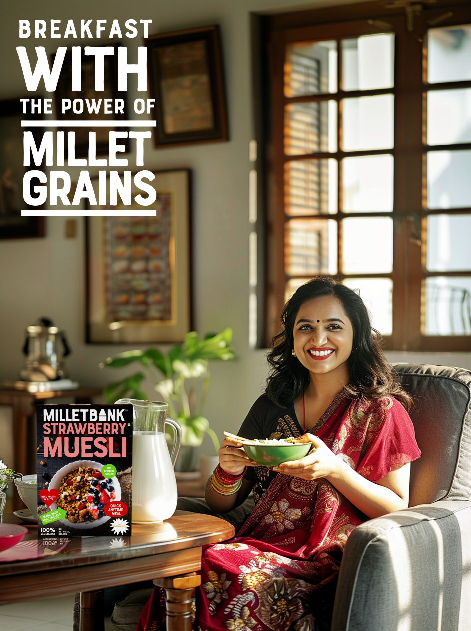 Introducing Millet Bank: Strawberry Muesli, the perfect anytime meal for health-conscious foodies! Our 100% vegetarian muesli is made with crunchy millet flakes, combined with a delightful blend of real strawberries and nut pieces that taste delicious and provide a satisfying crunch.
